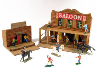 éclairage du saloon électrique (manque ampoule) - manque un autocollant de volet & l'inscription sur la façade du 2ème bâtiment - on y joint 14 figurines de la marque