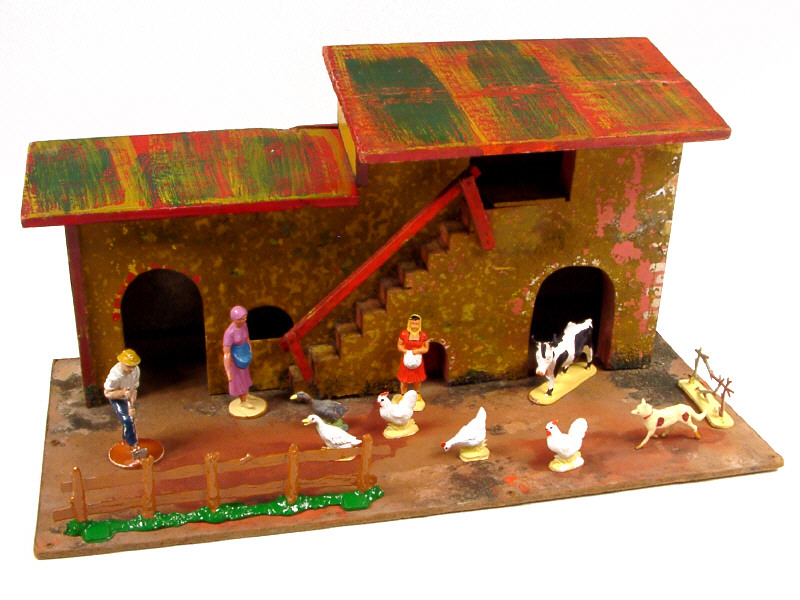 dimensions : 39 x 20 x 19 cm - manque clôtures d'entourage - on y joint 3 personnages, 7 animaux & 2 barrières