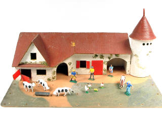 dimensions : 60 x 40 x 31 cm - manque quelques petits accessoires dont les clôtures & la cheminée - on y joint 8 animaux, 4 personnages & une mangeoire