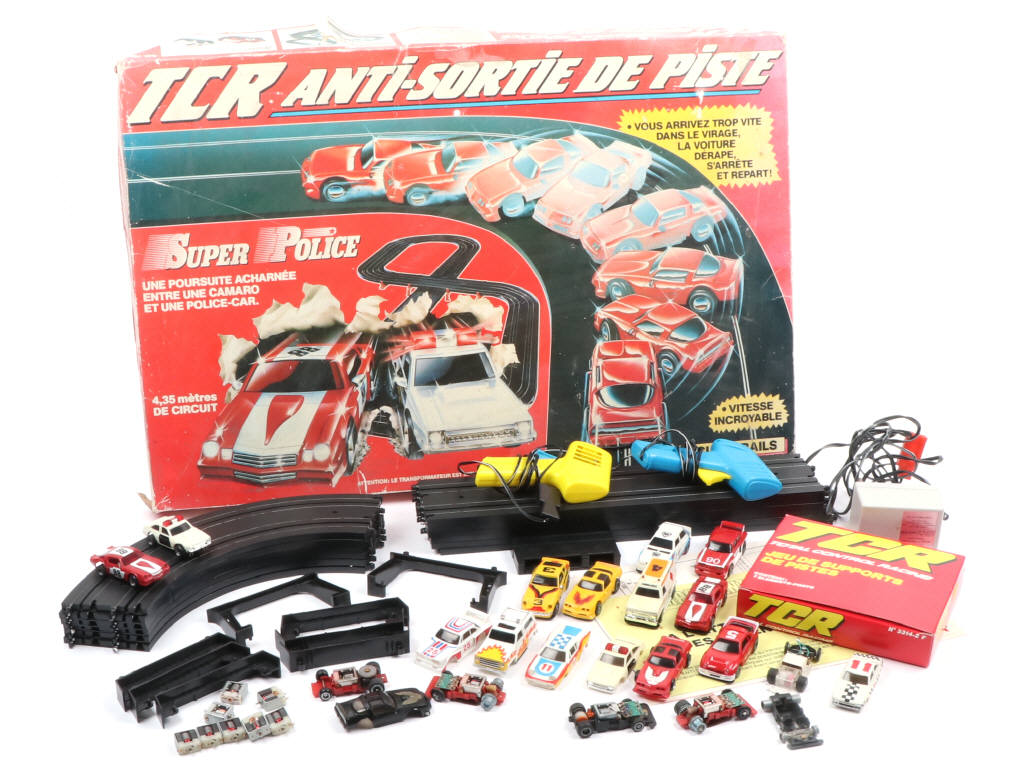 non testé - comprend : circuit TCR ANTI SORTIE DE PISTE (complet avec notice) - boite encrassée avec nombreuses déchirures, accrocs & frottements (polystyrène perforé) & un ensemble de voitures & pièces détachées - on y joint un jeu de supports de pistes (neuf)