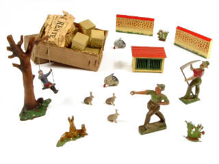 états de 'A' à 'D' - comprend : 2 fermiers, un enfant sur une balançoire accrochée à un arbre, 6 animaux, un clapier & 16 éléments de décor - 12 éléments de décor avec boîte d'origine & papier de calage dâté de 1935
