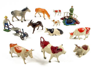 états de 'A' à 'C' - comprend : un fermier, un vagabond, 11 animaux, une charrue à un soc & une petite mare d'eau avec pont - légère fêlure sur la patte d'un animal