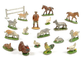 comprend : 5 chèvres, 2 poules, 2 lapins, 2 poulains, un coq, un dindon, un chat, un chien & une colombe
