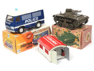 comprend : char 'TCHAD' (moteur à clef & mécanismes fonctionnent poussivement, manque 3 accessoires) & PEUGEOT J7 'POLICE' (moteur à friction fonctionne) - 2 exemplaires en boîtes (état 'c') - mécanisme du garage à revoir
