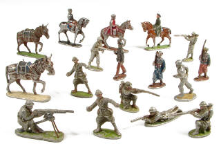 comprend : un Saint-Cyrien, un mitrailleur, un tireur couché, un spahi à cheval, 2 grenadiers, 2 tireurs accroupis, un chasseur alpin à cheval, un tireur debout, un zouave, un officier à cheval, un tirailleur marocain & un soldat américain - quelques petits manques