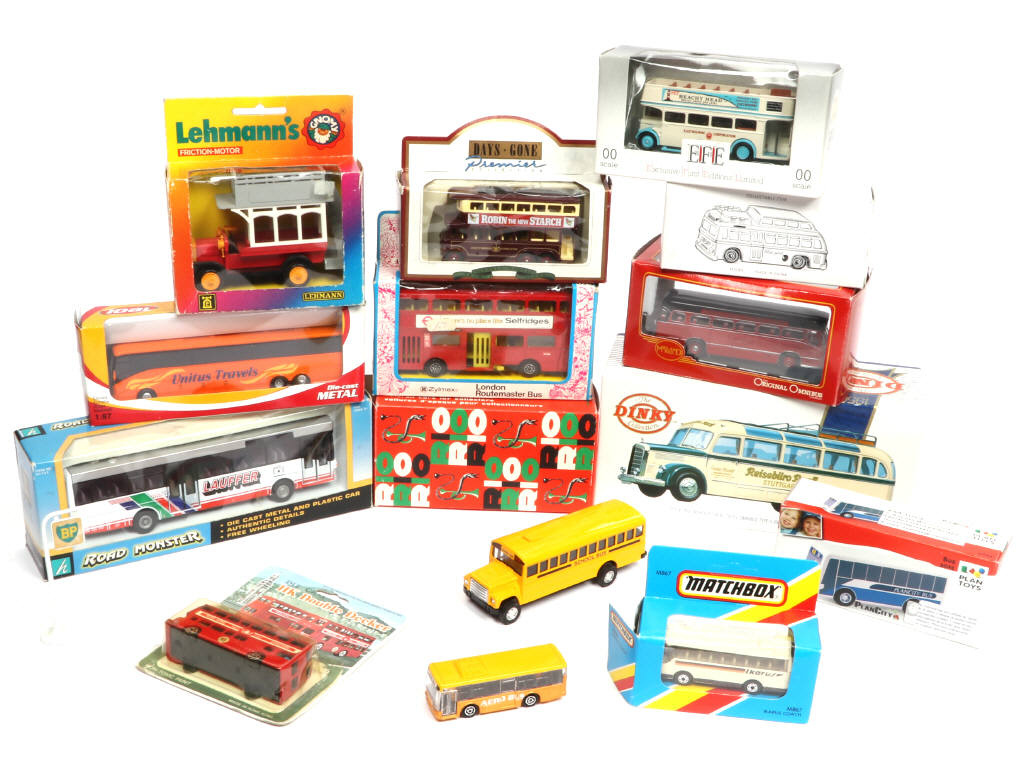 différentes échelles - comprend notamment les marques : RIO, MATCHBOX, JOAL & DAYS-GONE - on y joint un petit panneau "BP" - boîtes en états 'b' à 'c'