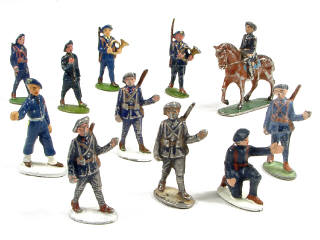 états de 'E' à 'R' - comprend : 2 soldats au cor, 4 muletiers, 2 porte-étendards (manque étendards) un soldat au défilé, un soldat genou à terre & un officier à cheval - un petit manque