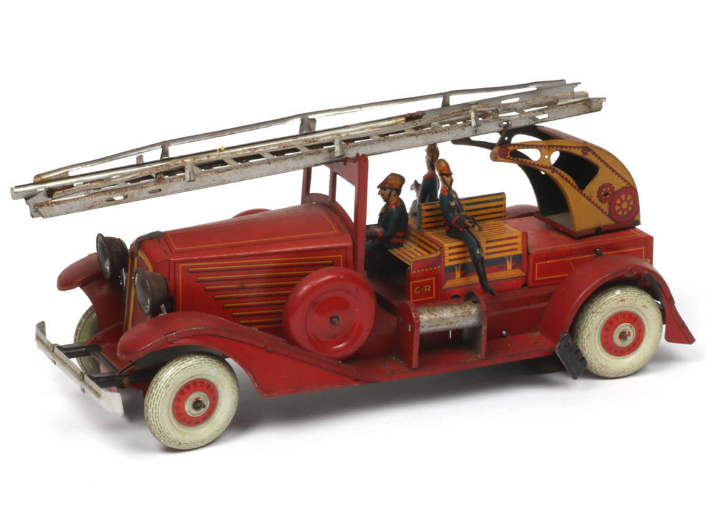 longueur : 37 cm - avec moteur à ressort (fonctionne poussivement) & 3 pompiers - certaines parties ternies avec traces d'oxydation plus ou moins importantes - échelle déformée avec parties cassées