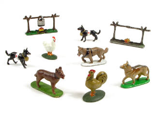 états de 'E' à 'R' - comprend : un chien de ferme, un chien de berger & un chien de carriole - on y joint 2 coqs & 2 chiens de secours de marque inconnue - manque marmite sur un des feux de camp