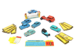 comprend notamment : RENAULT 8 GORDINI (transformations, manque 2 roues - plancher dériveté avec parties fondues - boite en état 'd'), PEUGEOT 204 break, 172R 1927 & PANAMERICAINE (moteurs à clef fonctionnels) - on y retrouve les marques : NOREV, JOUEF & FRANCE JOUETS - quelques manques & parties cassées - détails de peinture & décalques ajoutés - on y joint 12 socles de boite de la marque NOREV (états 'b' à 'd')