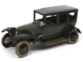 version sans pare-chocs avant ni malle arrière - longueur 33,5 cm - avec moteur à clef (fonctionne), clef, phare électrique (non testé, pile d'origine présente) & direction par le volant - parties noires repeintes & vertes recouvert d'un léger vernis (roues également) - dessous du modèle, intérieur & marchepieds non repeints - manque insigne de capot-moteur - petites traces d'oxydation par endroits