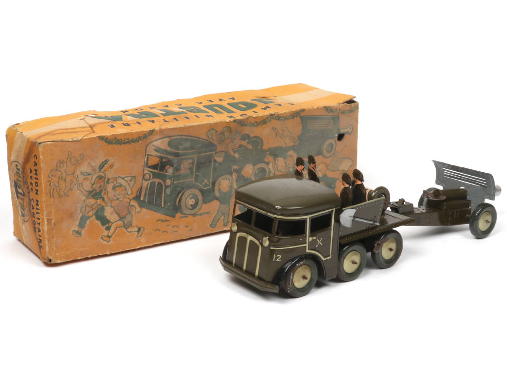 JOUSTRA (FRANCE) 701 Camion militaire avec canon en tôle lithographiée kaki