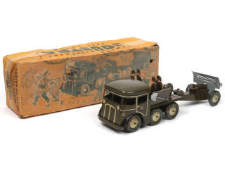longueur de l'ensemble : 42 cm - avec moteur à ressort (fonctionne), direction, 5 soldats & un outil (manque un autre exemplaire) - quelques traces d'oxydation plus ou moins importantes par endroits (principalement sur 3 roues) - boîte tachée & incomplète