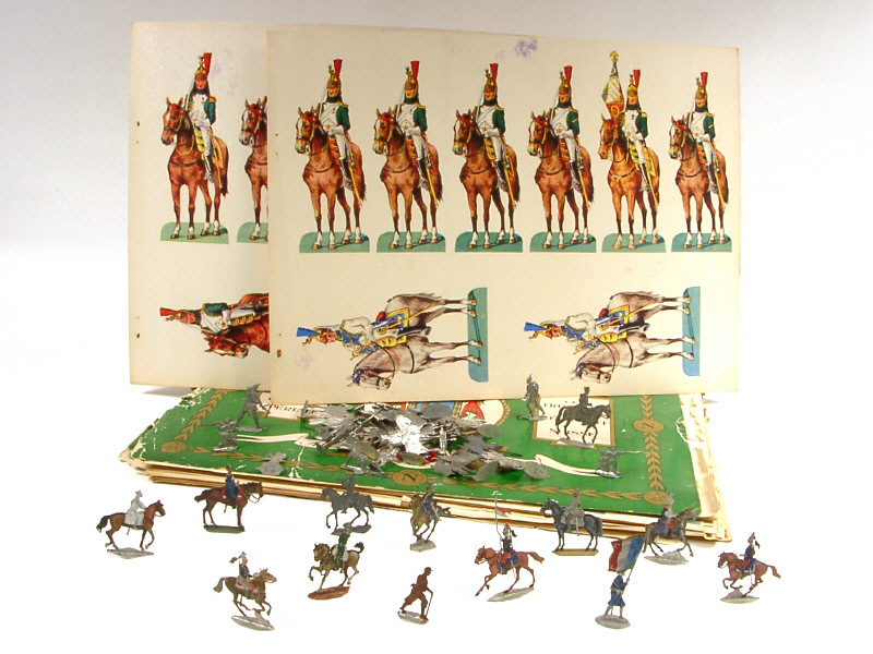 figurines en plats d'étain - comprend : 23 cavaliers & 23 fantassins - période fin XIXème & début XXème siècle - on y joint un album de planches de soldats napoléoniens à découper de marque EDITIONS KRUGER en état 'c'