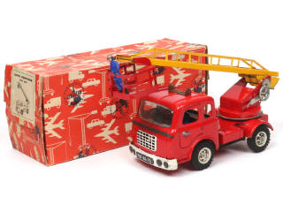longueur : 33 cm - avec moteur à clef (à revoir), portière conducteur ouvrante (une charnière manquante), échelle mobile & 2 pompiers - certaines parties chromées ternies (quelques traces d'oxydation) - une fixation d'échelle non d'origine