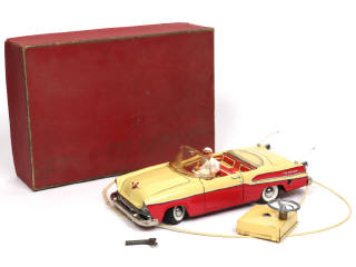 longueur : 26,5 cm - avec moteur à clef, direction (ensemble fonctionnel) & clef - pare-brise légèrement jauni, déformé avec une petite fêlure - manques de pellicule chromée sur les antennes - boîte salie (avec une cale)