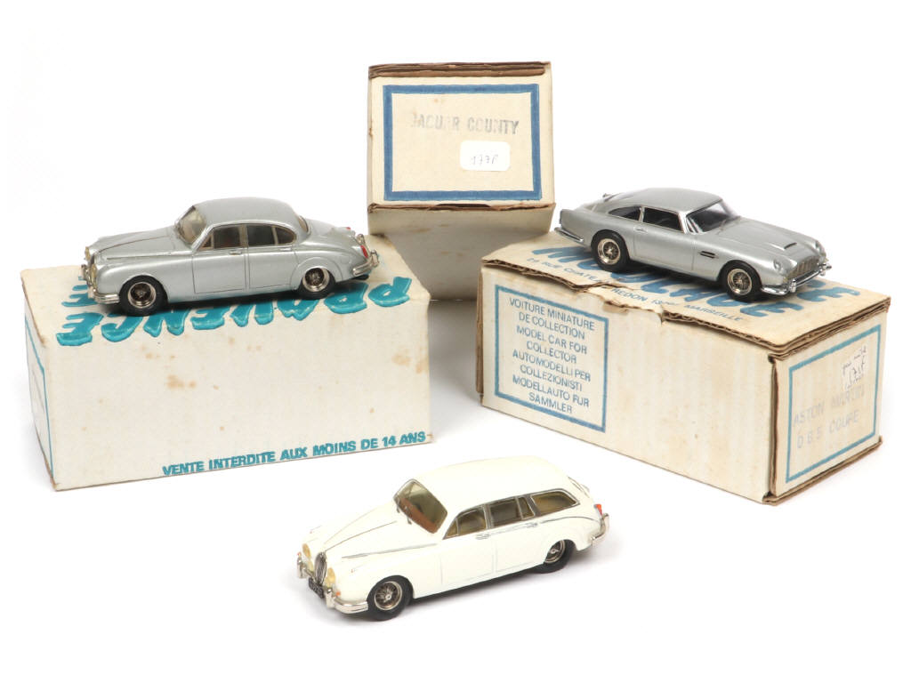 comprend : JAGUAR MKII, COUNTY & ASTON MARTIN DB5 coupé - un modèle avec petits éléments en partie décollés - petites déchirures sur un onglet de boite