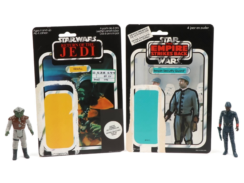 comprend : BESPIN SECURITY GARD (année 1981 - avec arme) & KLAATU (année 1983 - petits manques de peinture sur les mains & sur l'arrière de la figurine - vêtement & arme manquants) - cartes avec petits accrocs & manques de papier (blisters absents)