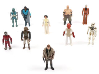 fabrication années 1970 & 1980 - comprend : HAN SOLO (manteau déchiré & coupé), LANDO CALRISSIAN (cape vinyl déchirée), 2-1B, PRINCESS LEIA, RANCON KEEPER, ADMIRAL ACKBAR, LANDO CALRISSIAN SKIFF GUARD, OBI WAN KENOBI, DEATH STAR DROID (important manque de peinture) & SNAGGLETOOTH - avec 4 armes - manques de peinture sur certaines figurines