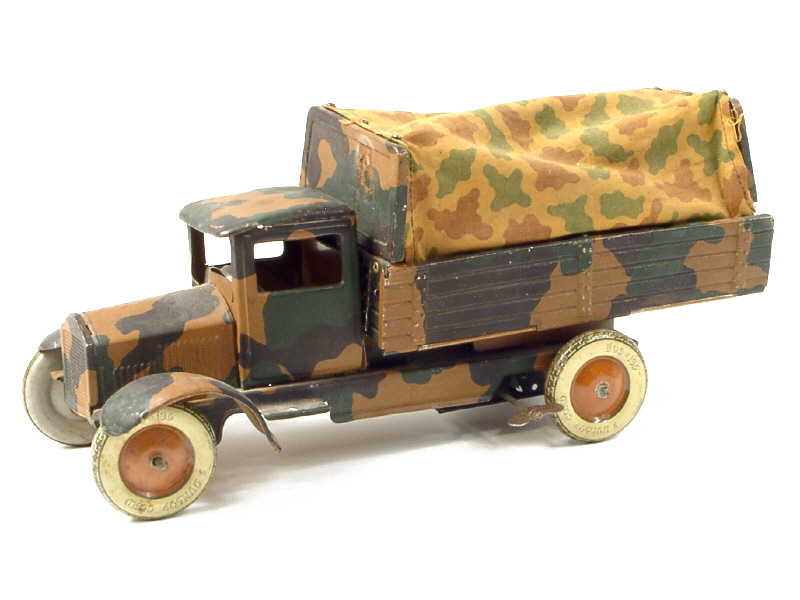 longueur 31 cm - en tôle - moteur à ressort (fonctionne) - avec bâche en tissu - direction (à revoir) - manque vraisemblablement le conducteur - plateau tordu - 31 cm long - tinplate - clockwork mechanism (in working condition) - with material cover & steering (subject to verification) - driver apparently missing - platform bent - SCARCE