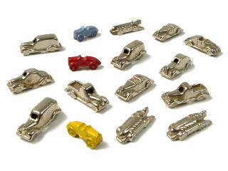 longueur 3,5 cm - modèles entièrement moulés sans roues mobiles - comprend : 3 fourgonnettes de livraison, 3 roadsters, 3 voitures de course, 2 pick-up & 2 coupés - on y joint 3 voitures de courses peintes de la même taille en plomb