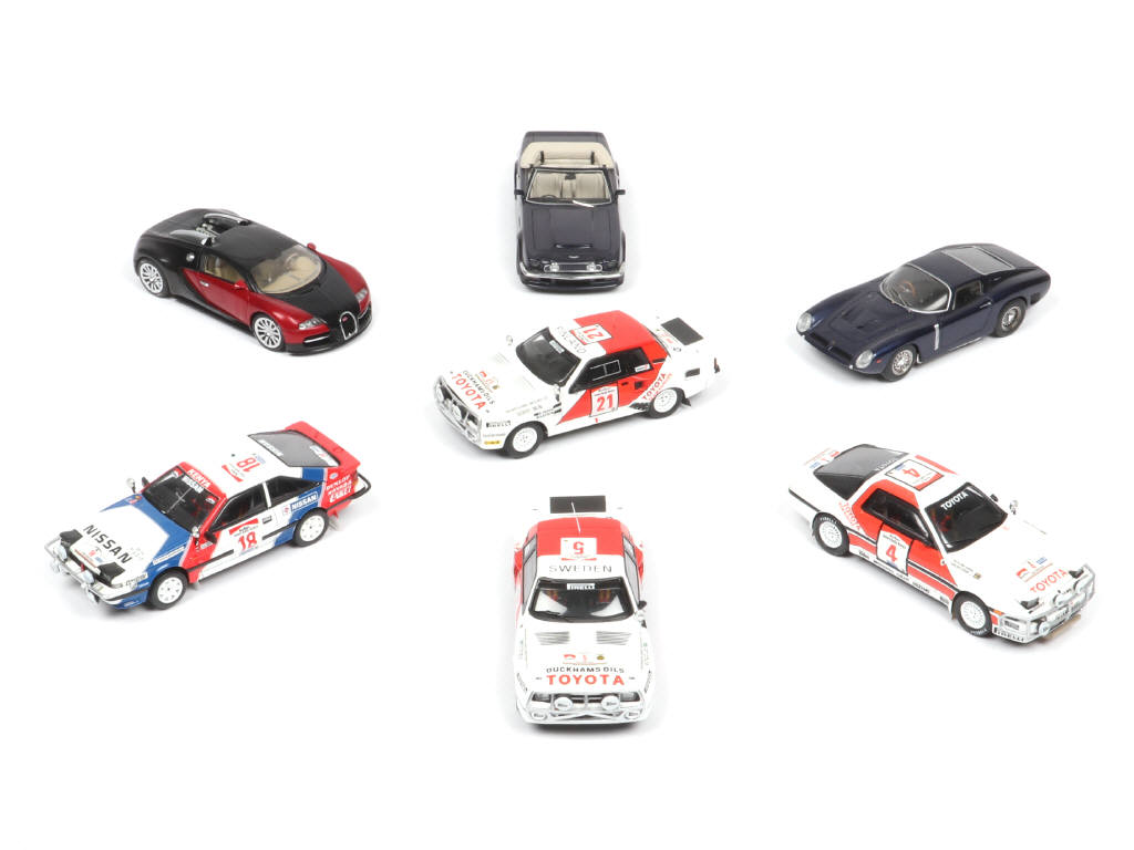 comprend notamment les modèles : TOYOTA, NISSAN & BIZZARINI - on y joint une BUGATTI de la marque SPARK - possibilité de petits éléments manquants