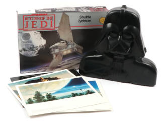 comprend : un portofolio contenant 20 dessins de l'artiste RALPH MCQUARRIE, un étui de rangement DARTH VADER (avec frottements) & une maquette SHUTTLE TYDIRIUM (sachets jamais ouverts) - on y retrouve les marques KENNER & MPC - boites avec accrocs, frottements & petites déchirtures