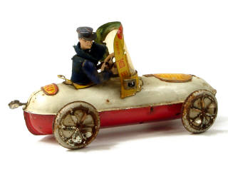 longueur 24 cm - fabriqué de 1907 à 1938 - moteur à ressort (fonctionne) - en action, le véhicule flotte & avance grâce aux aubes des roues tandis que le conducteur bouge sa tête - manque une lanterne & importantes traces de corrosion - 24 cm long - made between 1907-1938 - clockwork mechanism (in working condition) - in action, the car floats and moves forward thanks to the wheel blades & the driver moves his head - one lamp missing & significant rust