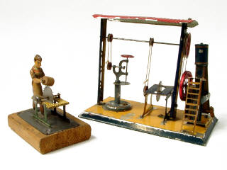 hauteur 10 cm - en tôle lithographiée - en action, le personnage donne l'illusion de découper un rondin sur sa scie circulaire - le mécanisme entraîné par une courroie était vraisemblablement associé à une machine à vapeur - socle en bois non d'origine - 10 cm tall - lithographed tinplate - in action, the character cuts a slice of wood on his circular saw - the belt that operates the model was apparently steam operated - wooden stand not original - SCARCE