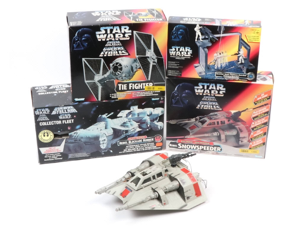 comprend : REBEL BLOCKADE RUNNER, TIE FIGHTER, REBEL SNOWSPEEDER (manque notice & cale) & DEATH STAR ESCAPE - jamais joué, boites ouvertes afin de les sortir pour les regarder - boites avec petits accrocs & frottements