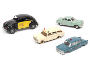 comprend notamment : VOLKSWAGEN COCCINELLE 'TAXI' (moteur à friction fonctionnel - quelques traces d'oxydation sur le plancher & sur le moteur - 2 pneus coupés), OPEL KAPITAN & SEAT 1400 C ambulance (planchers fortement oxydés & moteurs à revoir sur ces 2 derniers modèles) - on y retrouve les marques : COMANDO & RICO
