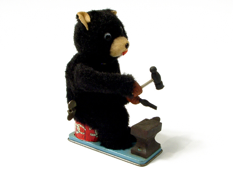 hauteur 15 cm - moteur à ressort (fonctionne) - en action, l'ours travaille une pièce avec son marteau sur une enclume - 15 cm tall - clockwork mechanism (in working condition) - in action, the bear hammers away on his anvil