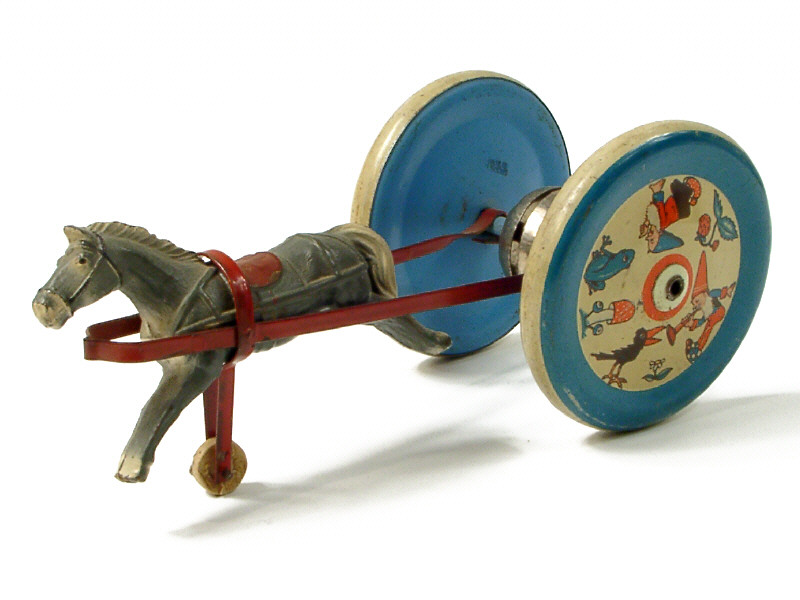 DIVERS (ALLEMAGNE) Jouet à tirer représentant un cheval attelé rouge, gris & bleu