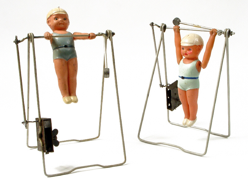 hauteur 33 cm - moteur à ressort (fonctionne) - en métal & en celluloïd - en action, l'enfant fait des acrobaties sur une barre fixe - 33 cm tall - clockwork mechanism (in working condition) - metal & celluloïd - in action, the child does acrobatics on the high bar