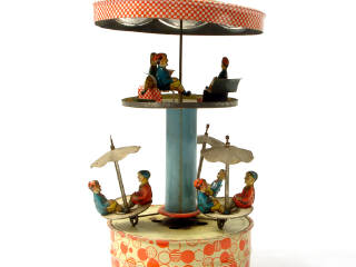 hauteur 21,5 - moteur à clef (à revoir) - en action, le manège se met à tourner entraînant les nacelles dans un mouvement circulaire - avec bruiteur 4 tons - 21.5 cm tall - wind-up mechanism (subject to verification) - in action, the ride rotates & the carraiges turn in circles - with 4 note sound effects