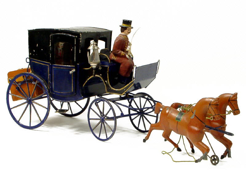 longueur 55 cm - très belle réalisation en tôle - avec attelage de 2 chevaux, 2 personnages & cocher - malle arrière en bois & en papier - un verre de lanterne cassé & un autre fendu - manque vitrage avant du fiacre - quelques fissures sur les personnages en composition - petits manques - fabrication vers 1890 - SUPERBE ! - 55 cm long - beautiful tinplate craftmanship - 2 characters, 2 horses & a coachman - rear trunk made of wood & paper - one of the lantern windows broken & another cracked - front windows missing from the carraige - some cracks on the composition characters - small parts missing - made around 1890 - VERY RARE