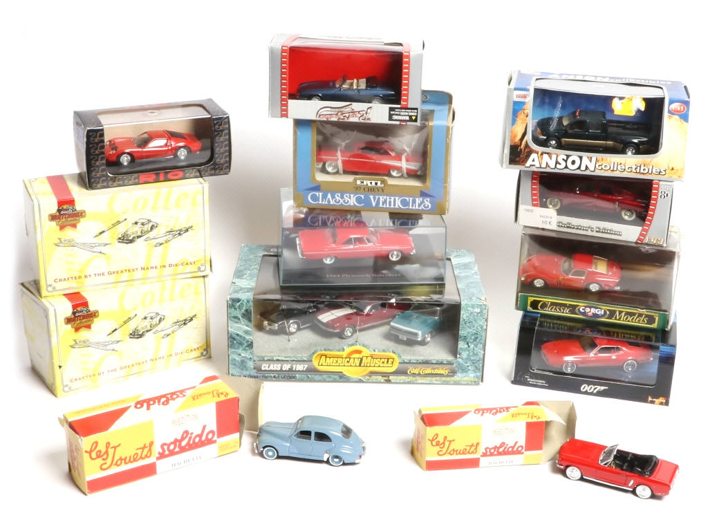 comprend notamment les marques : SOLIDO, MATCHBOX & CORGI - on y retrouve notamment les modèles : PEUGEOT 203, FORD MUSTANG & TUCKER TORPEDO - boîtes en états 'b' à 'c' possibilité de petits manques & parties cassées
