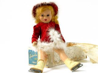hauteur 39 cm - articulée - yeux mobiles bleus - perruque blonde - bouche ouverte avec dents - avec robe rouge avec fourrure, patins à glace & coiffe à fourrure - petites craquelures - manque extrémité du pouce de la main droite - poupée représentant une célèbre patineuse artistique canadienne des années 1940 - 39 cm tall - moveable limbs & eyes (blue) - blond wig - open mouth with teeth - red fur dress, ice-skates & fur hat - small cracks - end of the right-hand thumb missing - she represents a famous Canadian ice-skater of the 1940s