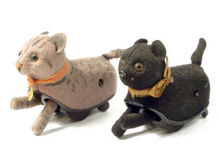 longueur 13 cm - moteurs à clef (poussifs) - en action, les animaux avancent en bougeant les pattes avant - 13 cm long - wind-up mechanism (works wheezily) - in action, the cats move forward using their front paws