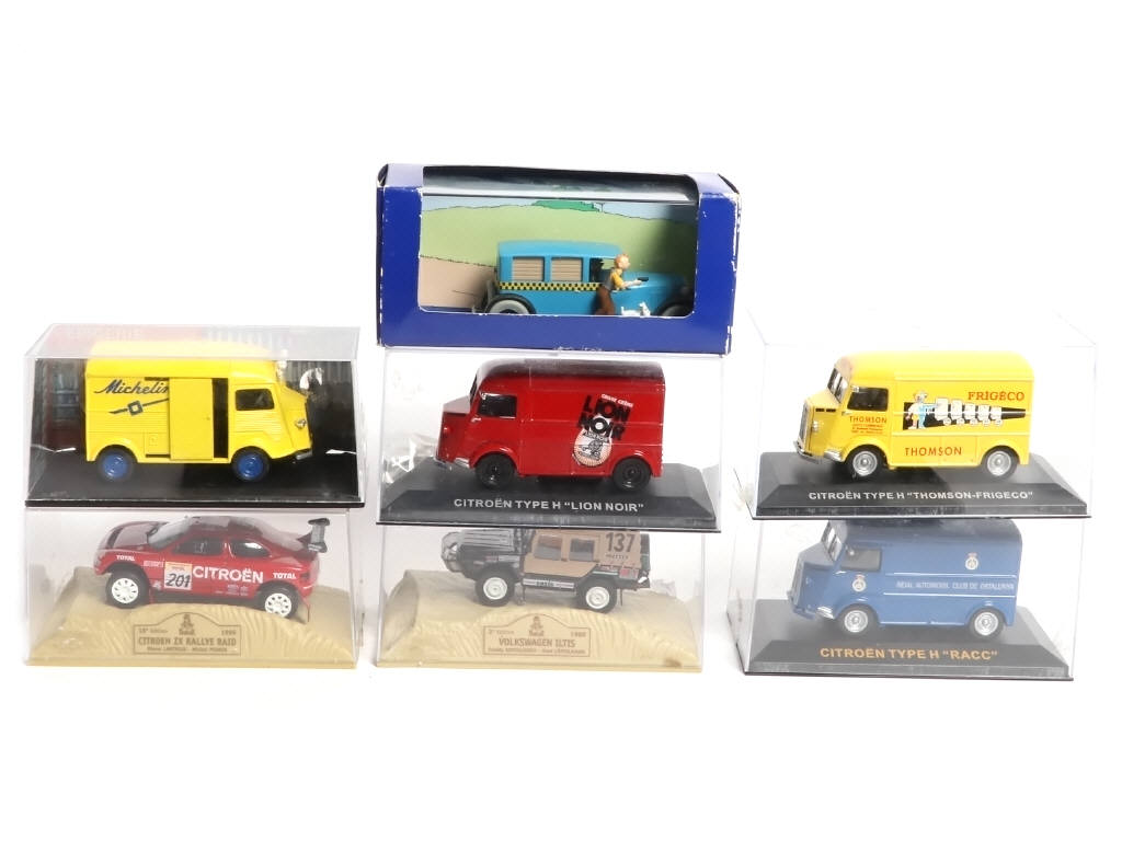 comprend notamment les modèles : VOLKSWAGEN ILTIS & CITROËN ZX RALLYE RAID (NOREV), 4 CITROËN TYPE H (LION NOIR, MICHELIN, RACC & THOMSON-FRIGECO) & Le Taxi de Tintin en Amérique (pas de socle de boîte)