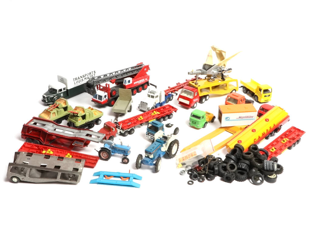 comprend notamment les marques : MATCHBOX, JOAL, CIJ & MAJORETTE - on y joint : 8 remorques & un lot de pneus de différentes tailles - possibilité de petits manques & parties cassées