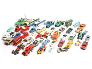 comprend notamment les marques : MATCHBOX, DINKY TOYS, MAJORETTE, CORGI TOYS & SOLIDO - on y retrouve notamment les modèles : avions, bus, camions, voitures & motos - petits manques & parties cassées