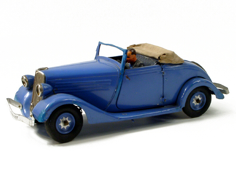 longueur 33 cm - moteur à clef (fonctionne) - avec direction par le volant (non d'origine) & clef - version de luxe de 1938 avec conducteur en composition (manque passagère), 4 aérateurs de capot horizontaux, pare-chocs rapportés marqués 'VIVASPORT', phares électriques, roue de secours & porte conducteur ouvrante - losange 'VIVASPORT' collé sur l'aile arrière droite - la capote dépliable est en toile - petites retouches & restauration sur la base des montants de pare-brise - TRES BEL ASPECT POUR UN MODELE DE CETTE EPOQUE !