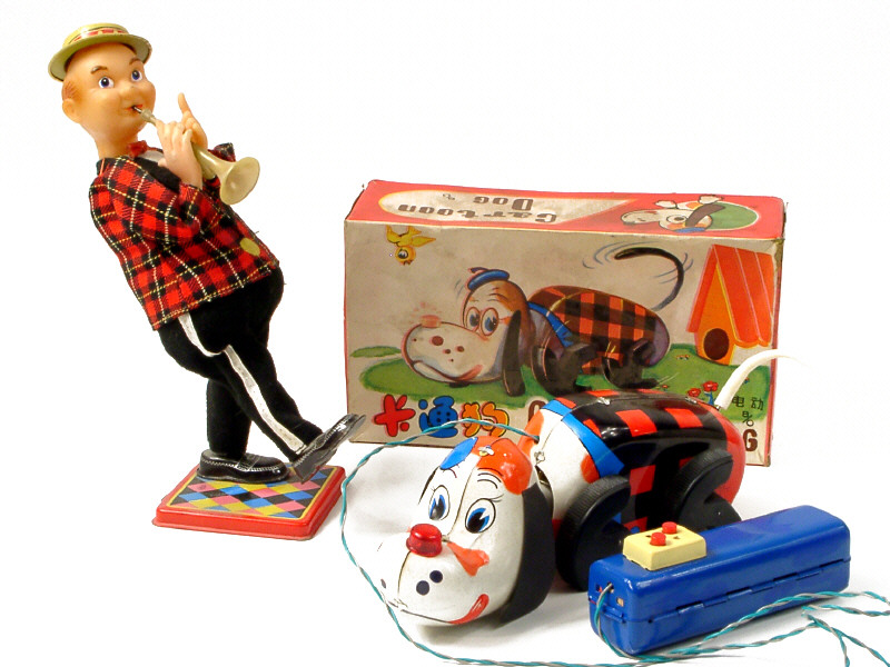 longueur 27 cm - moteur à piles (fonctionne) - avec télécommande - en action, le chien avance en se dandinant, sa tête & sa queue remuent tandis que son nez s'allume - 27 cm long - battery operated (in working condition) - with remote control - in action, the dog waddles forward as his head & tail wag from side-to-side & his nose lights up