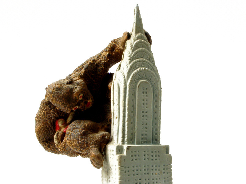 hauteur 31 cm - en caoutchouc - le building présenté est le 'CHRYSLER BUILDING' (au lieu de l'EMPIRE STATE BUILDING) - le caoutchouc du gorille est sec & craquelé - avec petite figurine dans le bras droit de l'animal - cet ensemble représente les personnages du célèbre film de 1932 - CURIOSITE !