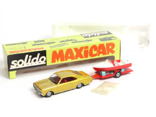 SOLIDO (FRANCE) 611 OPEL REKORD Coupé avec canot à moteur sur remorque vert jaune métal, bleu, rouge & blanc