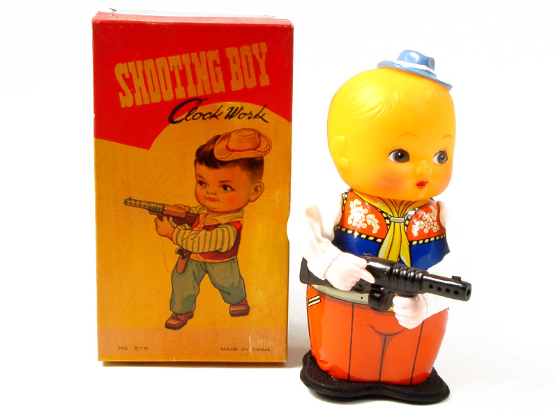 hauteur 17 cm - en tôle & en caoutchouc - moteur à clef (fonctionne) - avec clef - en action, le personnage avance puis s'arrête pour tirer tandis que le canon de sa mitraillette s'allume - système d'allumage du canon par pile (fonctionne) - avec cale de boîte - 17 cm tall - tinplate & rubber - wind-up mechanism (in working condition) - with key - in action, the character moves forward then stops to shoot as the barrel of his gun lights up - lighting system battery operated (in working condition) - with box insert
