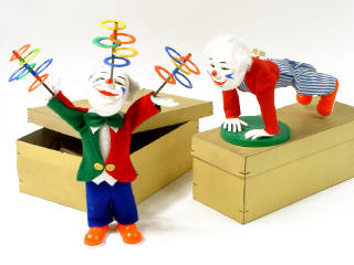 hauteur 28,5 cm - en plastique - moteur à ressort (fonctionne) - en action, le clown se balance de droite à gauche en jonglant avec des cerceaux - 28.5 cm tall - plastic - clockwork mechanism (in working condition) - in action, the clown rocks from side-to-side whilst juggling with hoops
