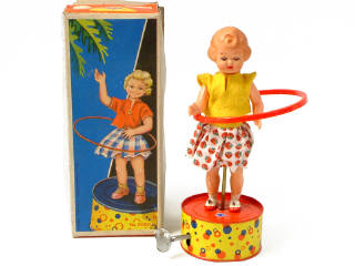 hauteur 22 cm - en tôle & plastique - moteur à clef (fonctionne) - avec clef - en action, la fillette fait tourner son cerceau autour de sa taille - les bras ont tendance à gêner le mécanisme - 22 cm - tinplate & plastic - wind-up mechanism (in working condition) - with key - in action, the girl does the hula hoop - her arms tend to get in the way of the mechanisms