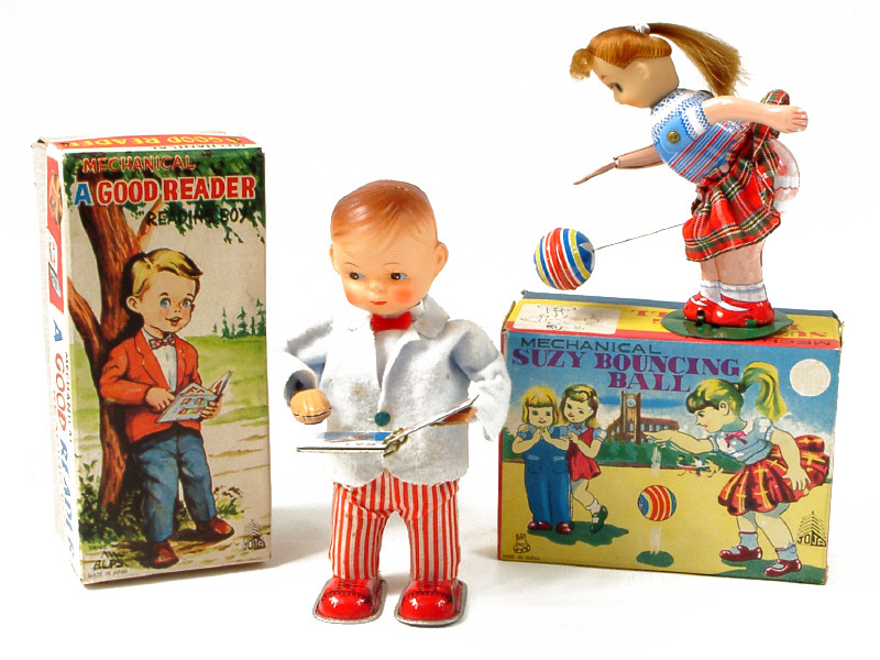 hauteur 13 cm - moteur à ressort (fonctionne) - en action, la fillette fait rebondir sa balle devant elle - 13 cm tall - clockwork mechanism (in working condition) - in action, the girl bounces the ball in front of her